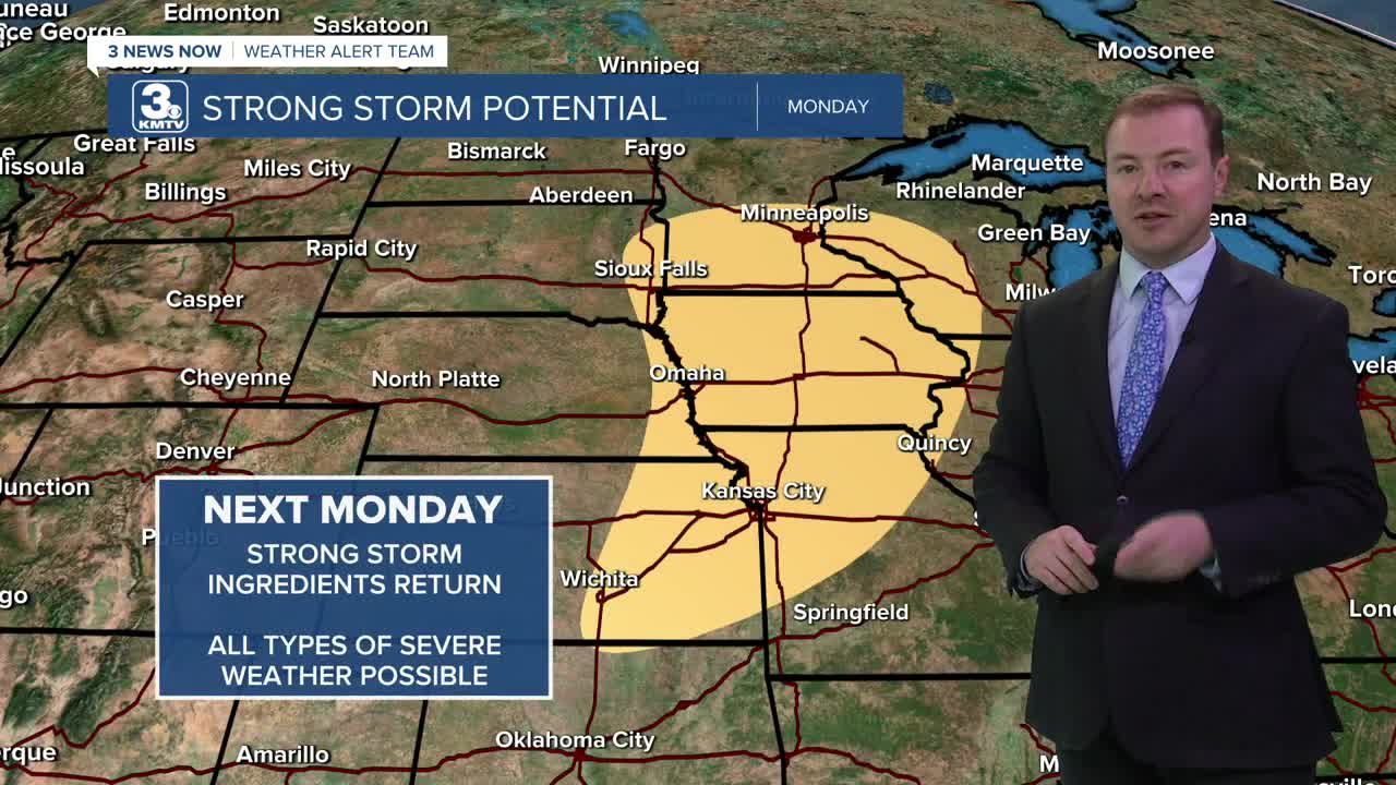 We are still monitoring for the potential of severe weather Monday afternoon through early Monday evening. A couple storms could start to pop up in eastern Nebraska early in the afternoon as a cold front begins to move through the region, but they will become more common in western Iowa and northwest Missouri by mid to late afternoon. Due to the arrival of the cold front and spotty nature of these storms, a number of neighborhoods will stay dry (especially in NE). All severe weather hazards will be possible Monday, especially very large hail, and the chance at tornadoes.