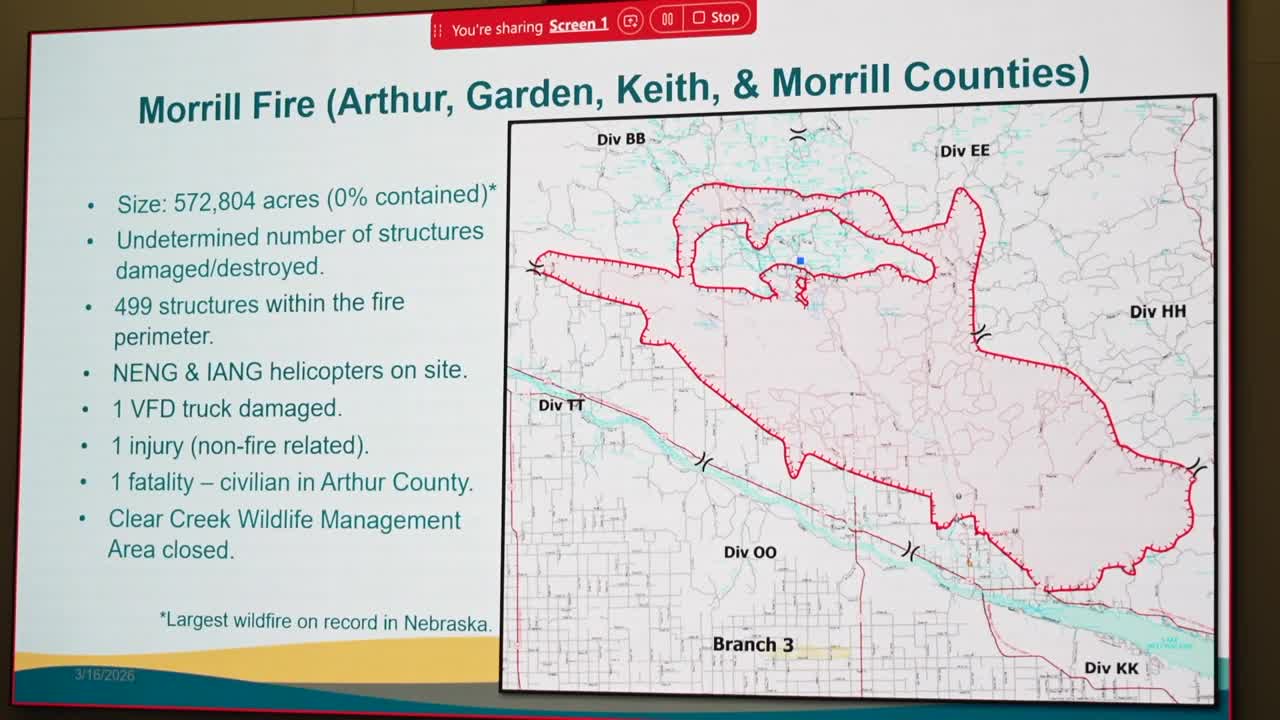 LINCOLN — LINCOLN, Neb. (KMTV) — Nebraska's Morrill and Cottonwood fires span 600,000+ acres at zero containment as leaders update on how agencies are working together.