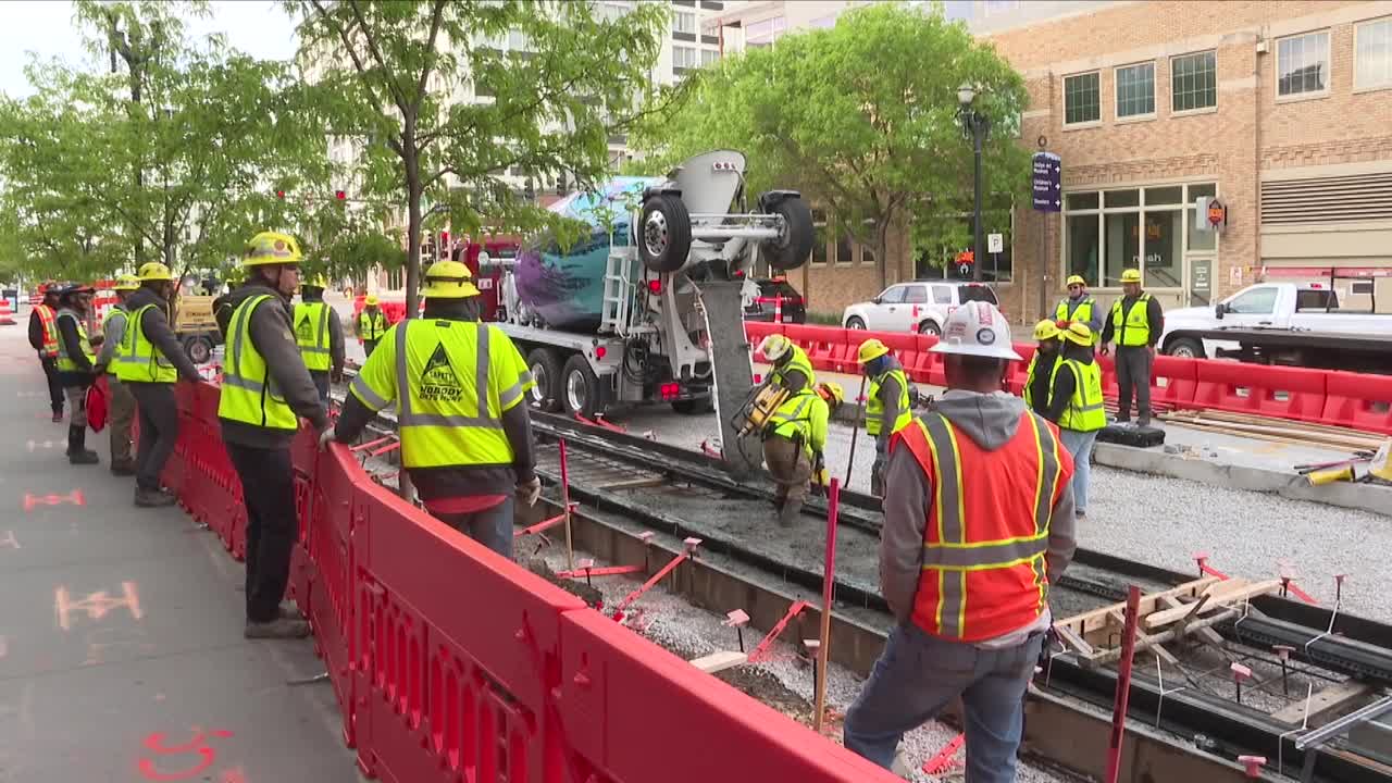 OMAHA, Neb. (KMTV) — Construction on the Omaha streetcar is advancing, with crews pouring cement and locking the first rails into place at 10th and Capitol Avenue.