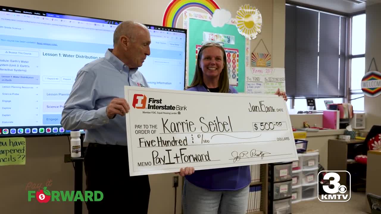 OMAHA, Neb. (KMTV) — Congratulations to Karrie Seibel, an Omaha teacher who received a $500.00 check from our 3 News Now Pay It Forward Campaign with First Interstate Bank.