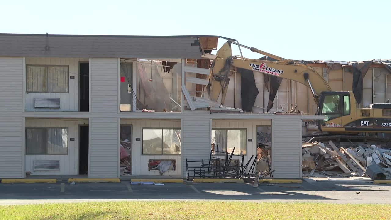 Demolition crews began tearing down the motel on Fort Crook Road early Friday morning. The property was one of four motels where prosecutors say women were prostituted and others were forced to work against their will.