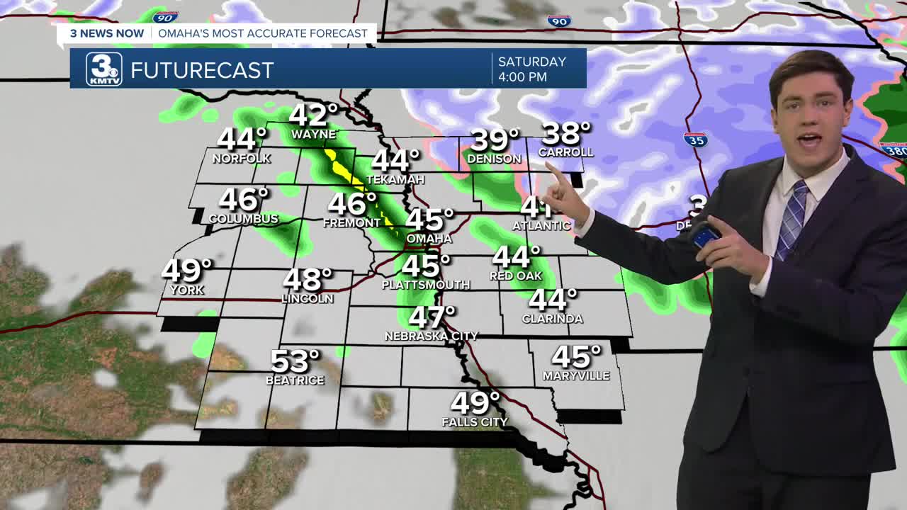 Colder air and rain arrive this weekend. Saturday will be mostly cloudy with scattered rain beginning in the morning, lasting through the evening. Temperatures vary on Saturday, reaching the 50s near and south of I-80/Omaha, and the 30s/40s north of I-80/Omaha. By Saturday evening, most areas will be cooling into the mid 30s.