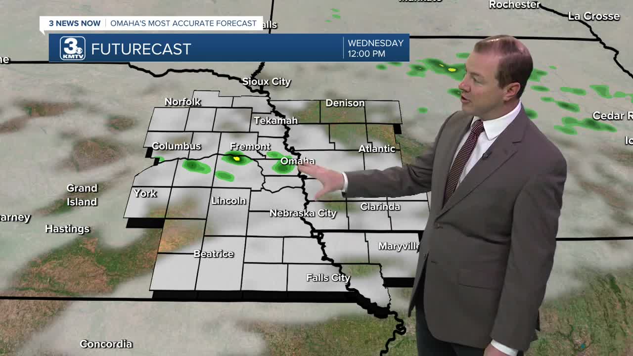 We'll start Wednesday morning with some spotty rain around, keeping things mostly cloudy during the day. A warm front will be lifting north through the region during the day, pushing most of the rain north of Omaha by the afternoon. Highs will be in the 70s north of Omaha, but south Omaha could reach the low 80s as the warmer air moves in.