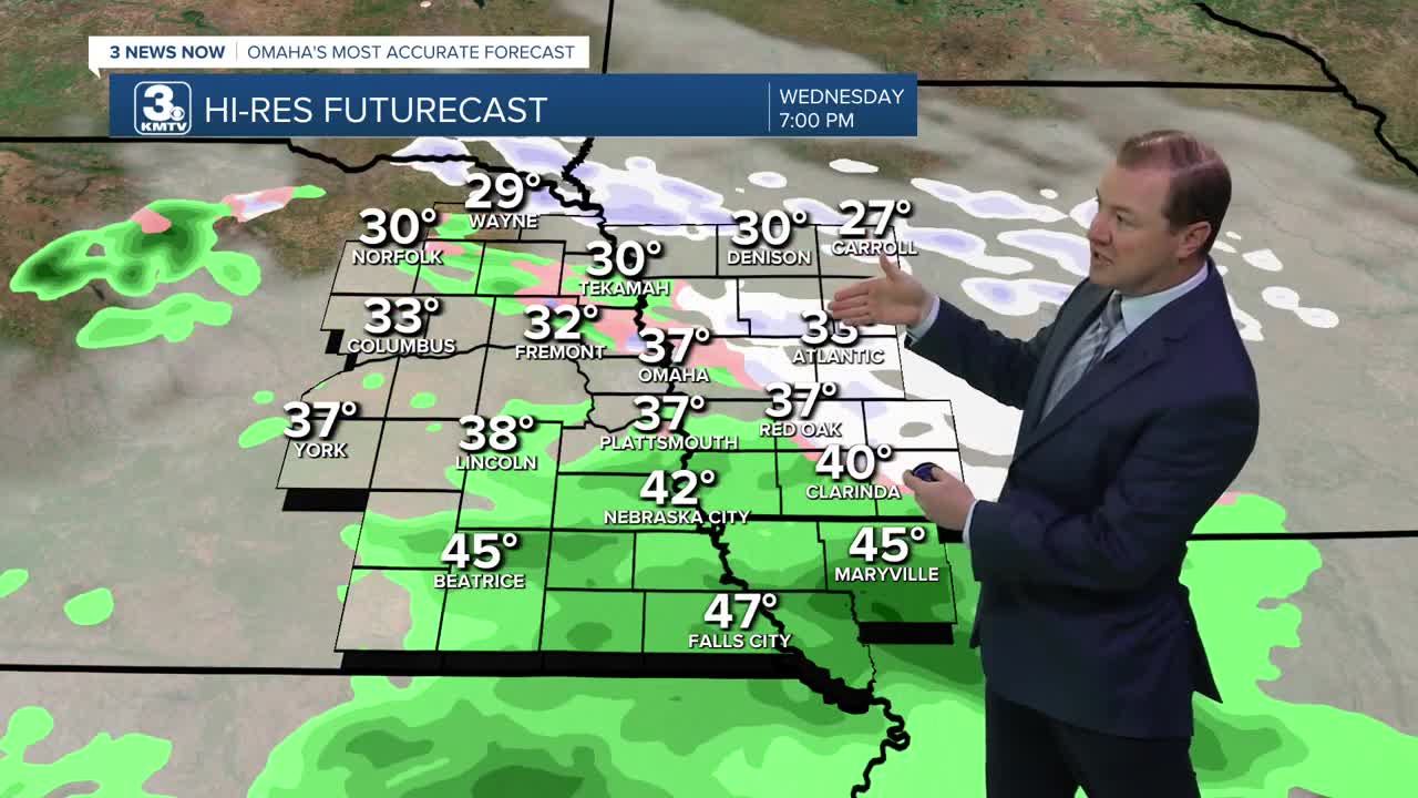 A light wintry mix will move through Omaha this evening. Air temps will be above freezing for most, which will melt any snow. But for those who live in western Iowa, some minor snow amounts less than 1" will be possible. Roads may be slick for a few hours while this passes through.
