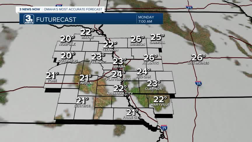 We are mostly cloudy to begin the workweek, but no significant cooldown is in sight. Highs on Monday are in the upper 30s to low 40s, and highs on Tuesday are in the mid-30s with a couple of snow flurries.