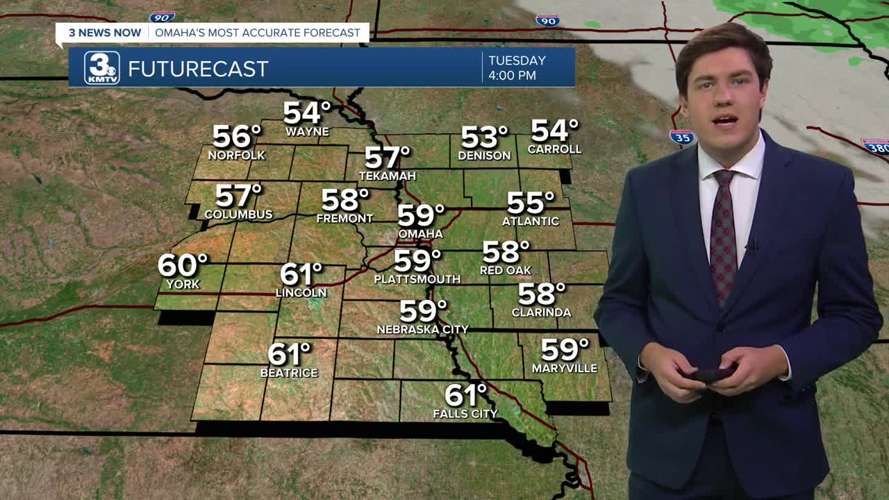 Tuesday will be mostly sunny, windy, and cooler. Highs will be in the upper 50s, putting Omaha a touch below average.