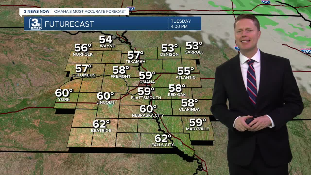Tuesday will be mostly sunny, windy, and cooler. Highs will be in the upper 50s, putting Omaha a touch below average.