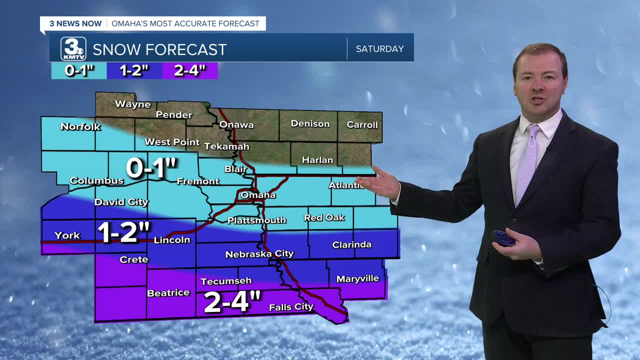 This spotty snow will become more scattered by Saturday morning, leaving some small snow accumulations of 1" around the Omaha metro. To our south, snow amounts may reach 2-4" closer to the Kansas/Nebraska border.