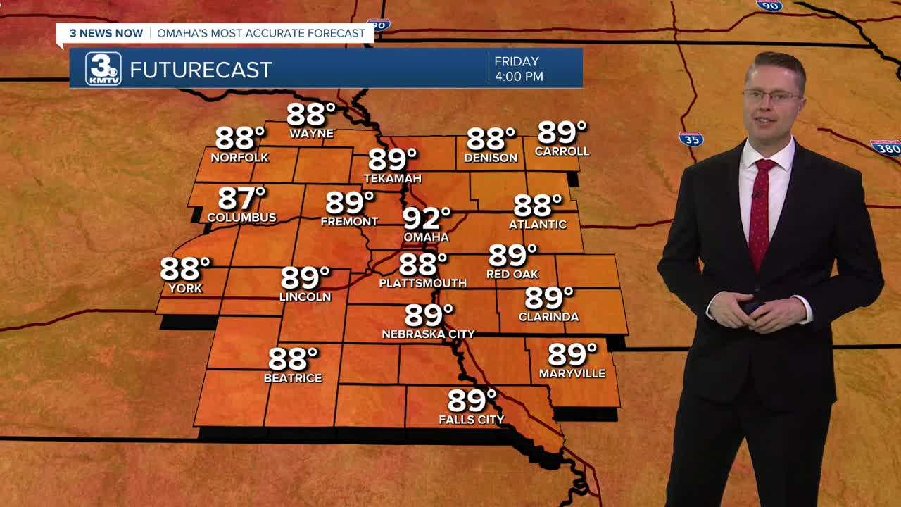 Scattered showers and storms will continue Monday with about half of eastern Nebraska and western Iowa seeing more rain. Everyone will be a lot cooler! Omaha will only reach the upper 60s in the afternoon.