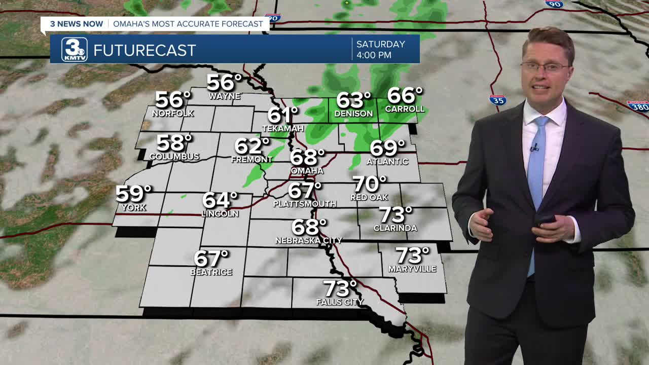 Saturday starts with some sunshine and temperatures ranging from the upper 40s to low 50s. Clouds move back in for the afternoon with highs in the upper 60s. Another batch of rain will move into northeast Nebraska early in the afternoon, then it swings towards Omaha around the late afternoon to evening. The farther south you live, the better chance you have of staying dry.