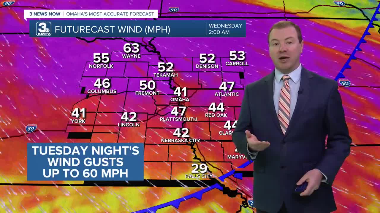 A high wind warning is in effect for Tuesday night around Omaha, where the wind gust potential will be around 50-60mph north of Omaha, and 45-55mph south of Omaha. Isolated power outages are possible overnight due to the wind. Also, make sure to secure you holiday decorations.