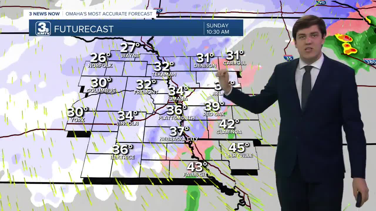 The cold front arrives in Omaha around 8 am, dropping temperatures throughout the day. By Sunday afternoon, the temperatures will have dropped into the mid-20s. The cold front will also bring high winds to the region. Nebraska and Iowa could see sustained winds between 30 and 50 mph, with wind gusts of 60-70 mph. For context, a thunderstorm is considered severe with 58+ mph winds. Therefore, some broken tree branches or power outages are possible with the wind.