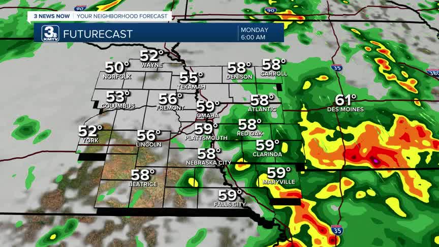 More storms will roll in from the south after midnight. While an isolated strong storm is possible along the Kansas/Nebraska border, these storms should remain below severe levels. These storms will begin to push east by the AM commute on Monday.