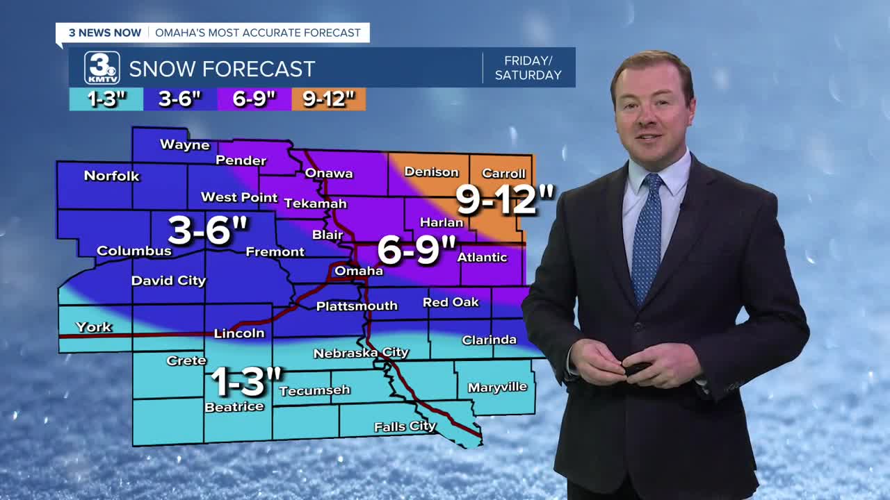 The lowest totals will be across southeast NE, with less than 3" expected. This is also where we expect there to be some minor ice accumulation due to a mixture of freezing rain/sleet. The Omaha metro is in the 3-6" range. In western Iowa, neighborhoods could see up to 6-9", with some locations near Carroll perhaps seeing a foot of snow. Snow totals will depend on when the wintry mix-to-snow transition occurs in your neighborhood.