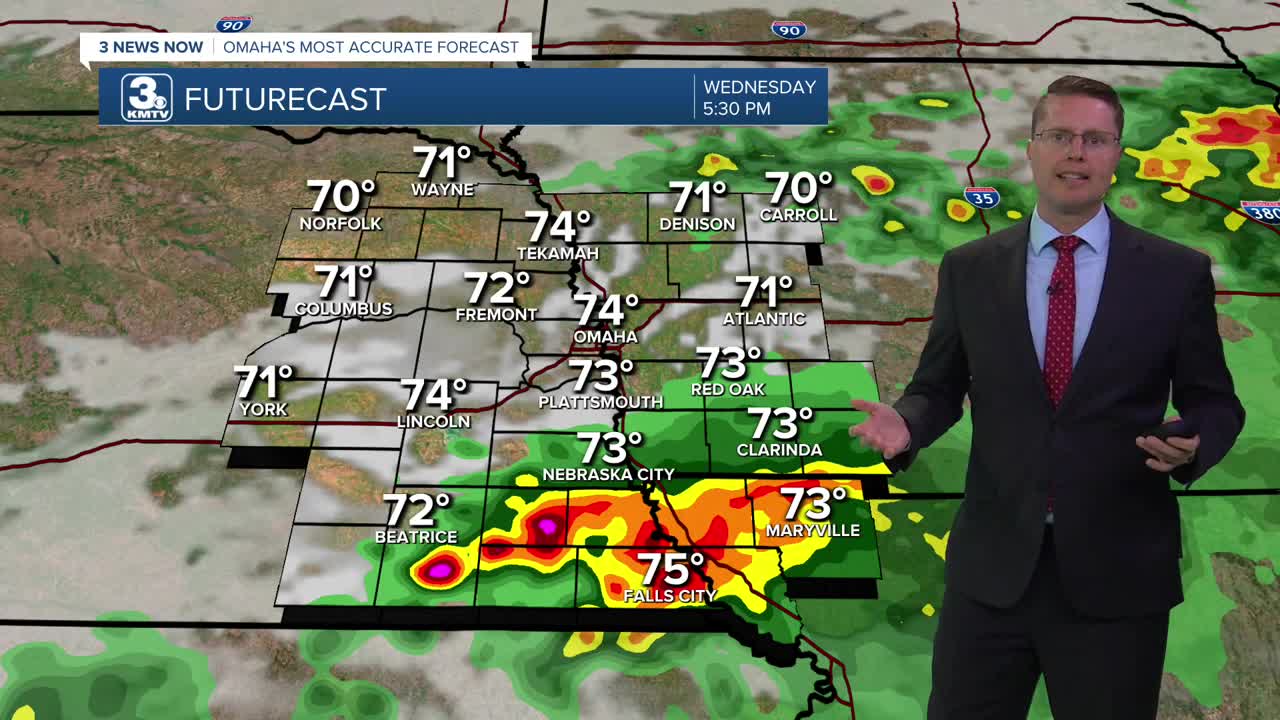 After a dry start to Wednesday, scattered rain will start to move into neighborhoods south of Omaha around the lunch hour. Later in the day, a couple storms could mix in with the scattered rain as it expands into more of eastern Nebraska and western Iowa. Like most storms in spring, these could come with a couple pockets of hail and extra wind. A majority of us will see rain by the end of Wednesday, but there will be plenty of dry time during the day, letting us warm up into the mid 70s.