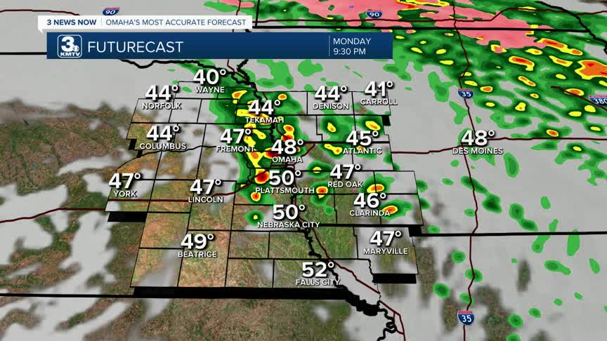 Monday brings our first chance of rain for the week. Through the day, it will be mostly cloudy, breezy, and seasonal with highs in the mid-50s. Some sprinkles are possible beginning around midday, but the best chance of rain will be Monday evening into Monday night. Not everyone will see rain, with neighborhoods Omaha and to the northeast having the best shot at rain. Any rain is gone by Tuesday morning.