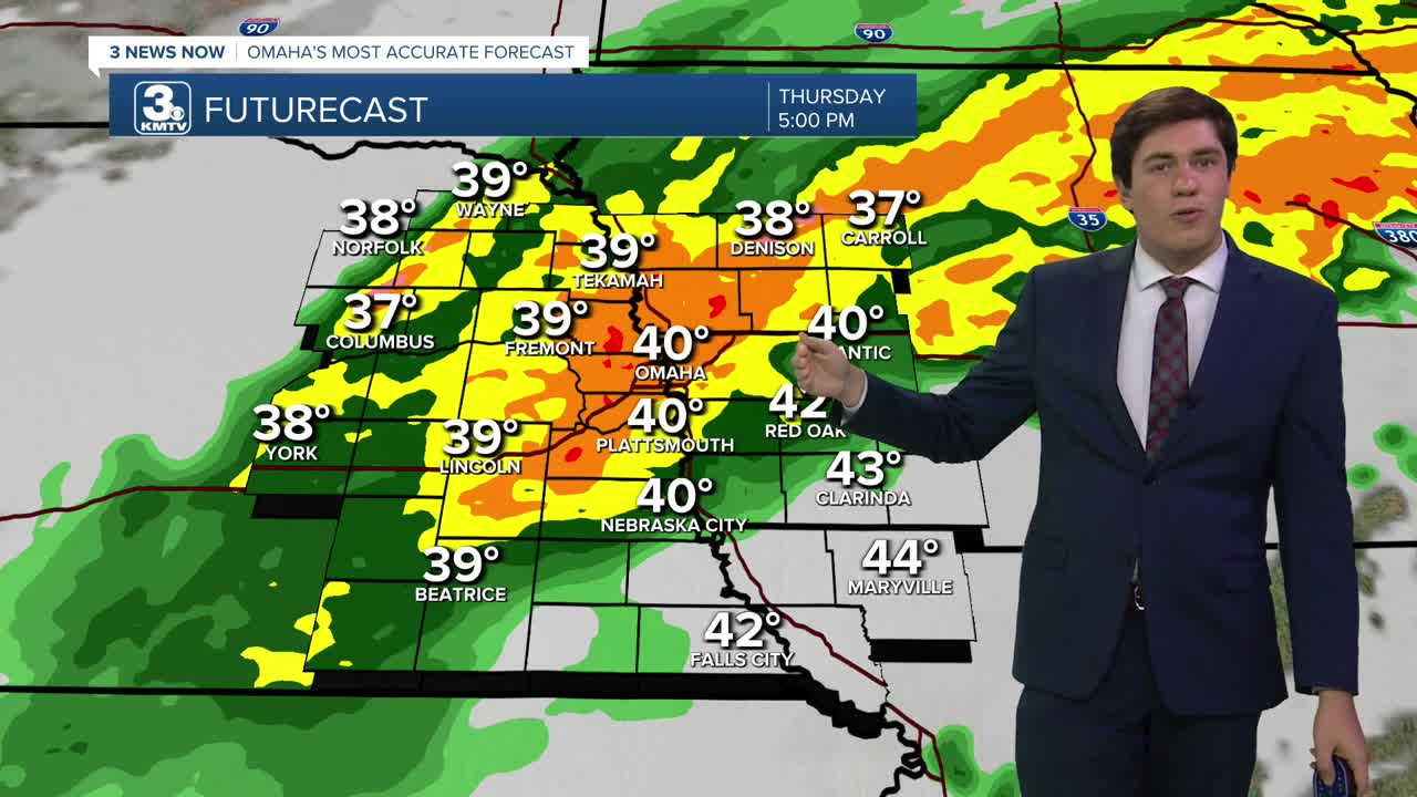 Rain continues through the day. We all will see rain at some point. Rain will be moderate to heavy at times, and we could even hear a rumble of thunder or two. Rainfall amounts will range from very little over NE Nebraska to over 1/2" in Omaha & Southeast. Temperatures will be in the low 40s for most of the day.