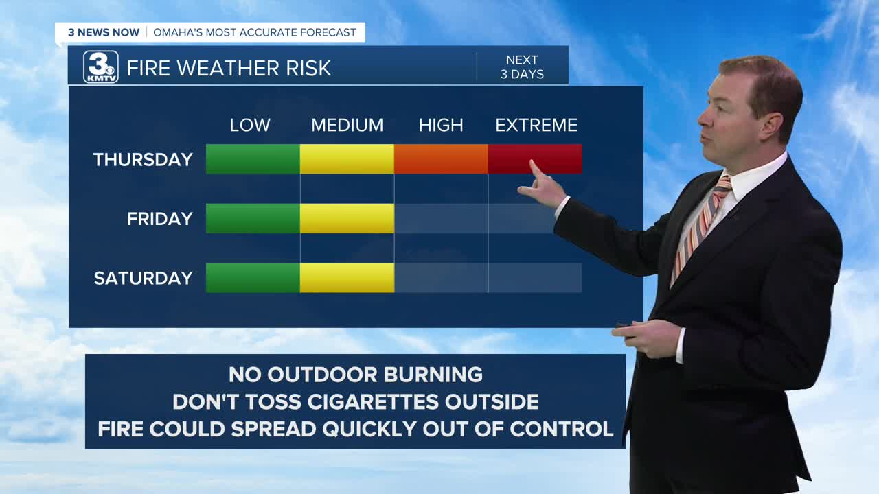 It gets windy Thursday and due to very low humidity around the region, we will be under wildfire conditions across all of Nebraska and much of west Iowa. The National Weather Service has issued a red flag warning for the region, So hold off on burning anything, and be very careful with trailer chains that could be dragging, for anything flammable.