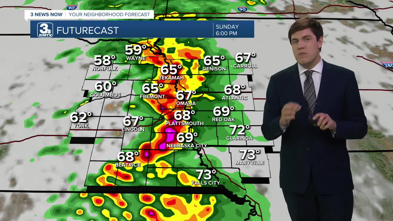 We dry out for Sunday morning, and the first half of Sunday is dry as highs reach the upper 60s. By the afternoon, a second wave of thunderstorms will move west to east between 3-9 pm. These storms could be severe with some large hail and gusty winds, mostly Omaha and south.