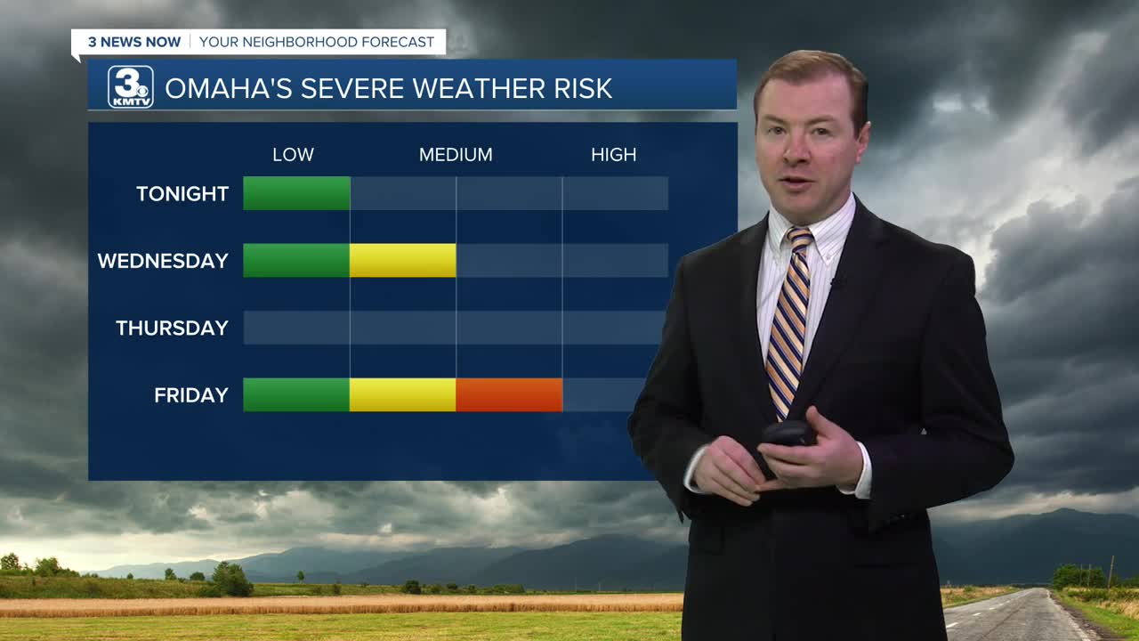 It will be a partly cloudy and mostly dry evening around Omaha. Later tonight, spotty storms will begin bubbling up across the Kansas/Nebraska border, moving across Omaha and western Iowa overnight. A few pockets of small hail may be possible, but the severe weather potential stays limited overnight. This rain will clear up by Wednesday morning.