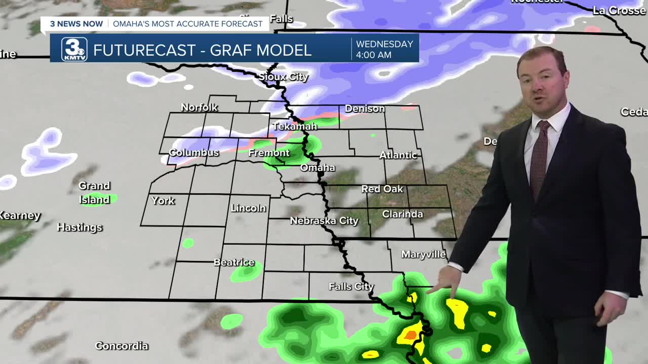 Heading into Tuesday night, a few spotty rain and storms may clip parts of far southeast Nebraska and northwest Missouri. But a lot of us will be dry overnight