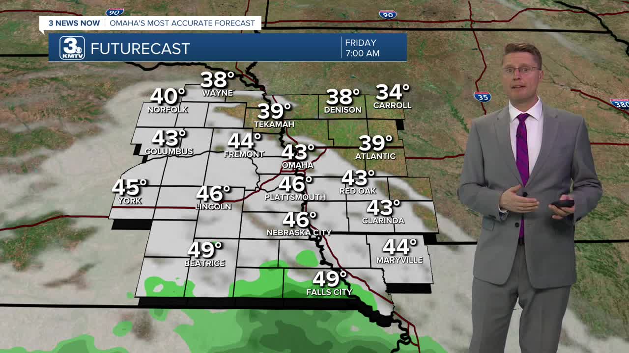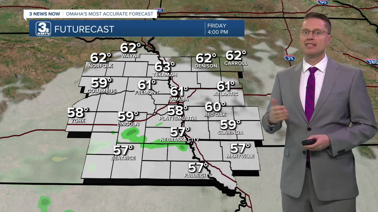Throughout Friday, those clouds could squeeze out a few spotty and light showers. There won't be many of them, so most of us stay dry. The slightly better chance of getting hit by one will be south of Omaha. It will also be a little breezy and cooler with upper 50s and low 60s across eastern Nebraska and western Iowa.