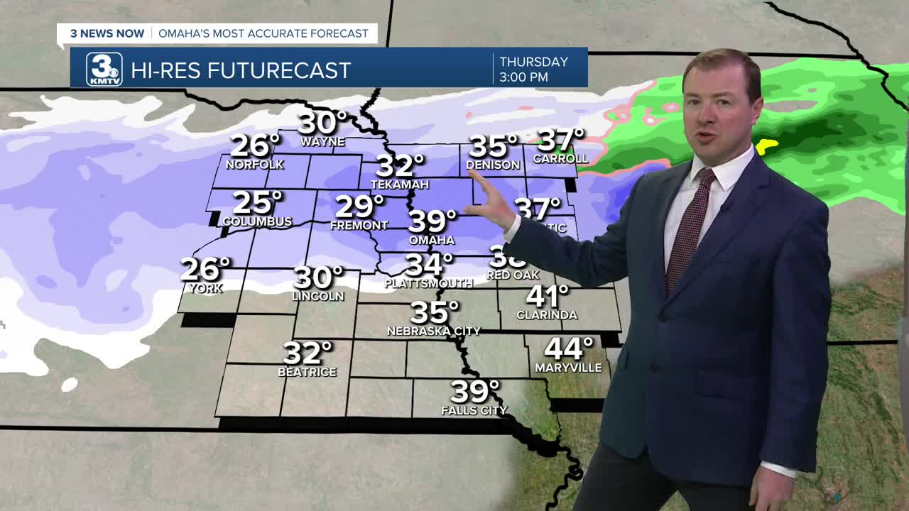 A light rain and snow mix will move into the region starting early Thursday morning, becoming widespread in the afternoon before changing over to all snow late in the afternoon, exiting late in the evening. It will be a breezy day with highs in the mid 40s south of Omaha, and only in the 30s in and north of Omaha. Winds could gust to around 35-40mph.