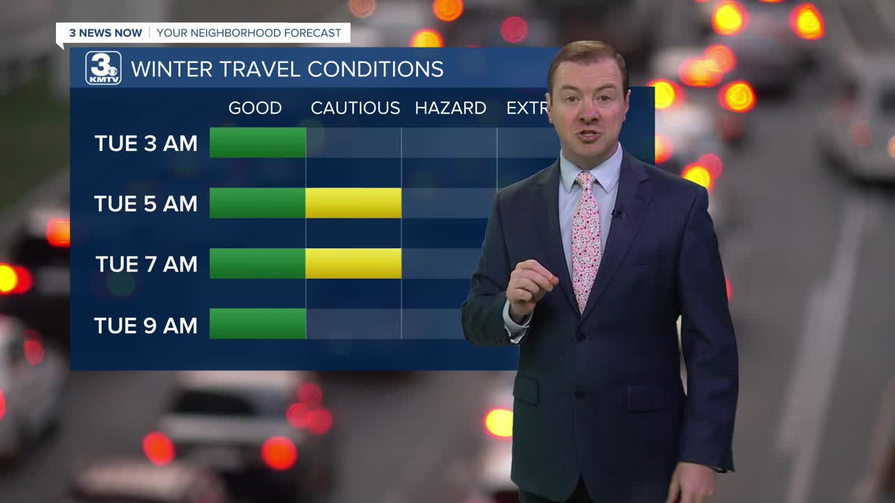 Most will see less than 1" of snow. Not everyone in the dark blue will see 1-3" as the band will be narrow, but this is where the best chance to see those higher amounts. Roads may be slushy and snow-covered in the Omaha metro and across western Iowa. Expect some slower travel for the Tuesday AM commute.