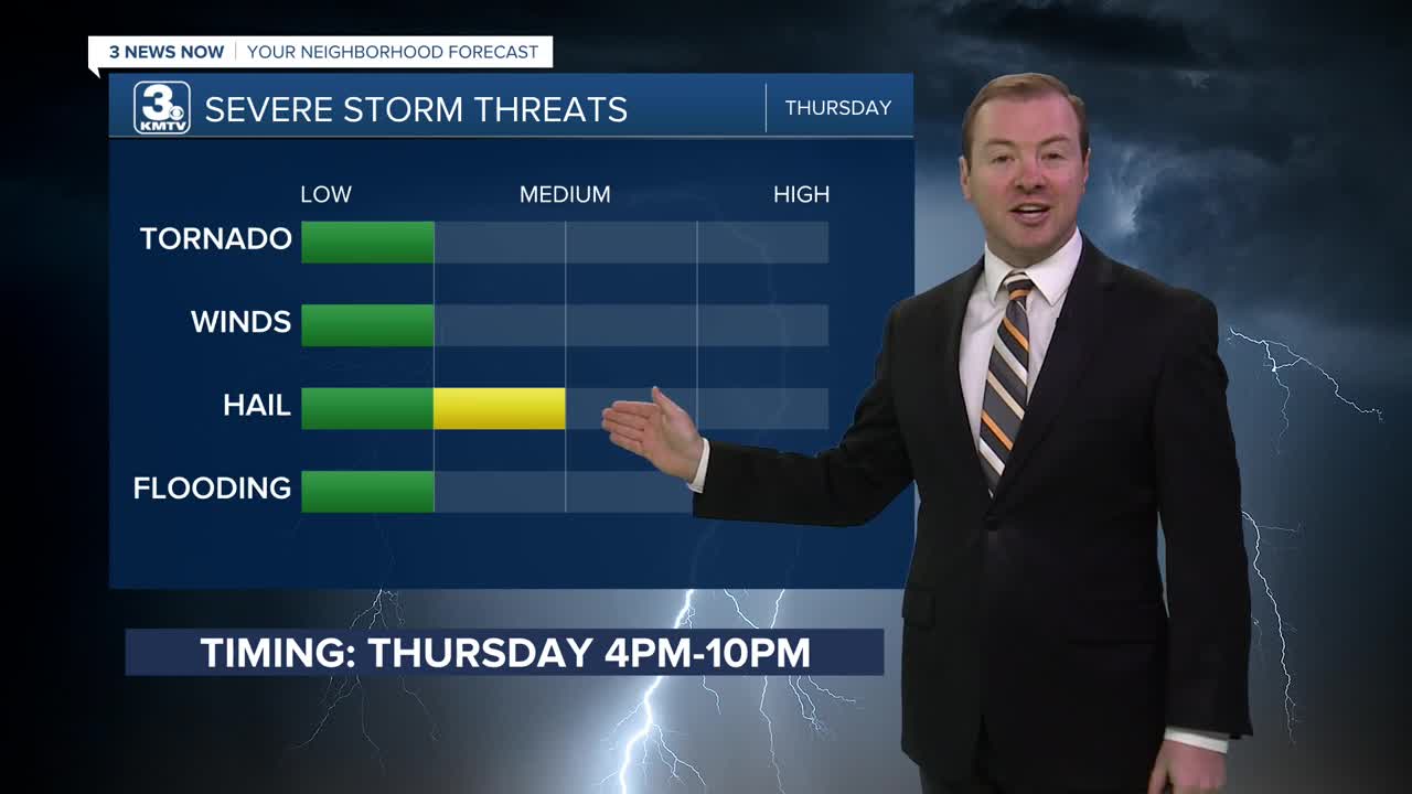 As the front stalls along the Nebraska and Kansas border tonight, we could see a few rounds of storms on Thursday, starting later in the morning, and a few could have hail in the afternoon and evening. The most probable locations to see hail will be south of Omaha/I-80.