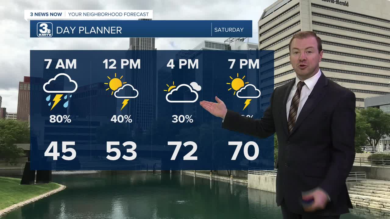 Off-and-on rounds of storms are likely Saturday morning, and like we have seen earlier this week, small hail may possible. It will be drier in the afternoon with temps holding in the 40s and 50s.