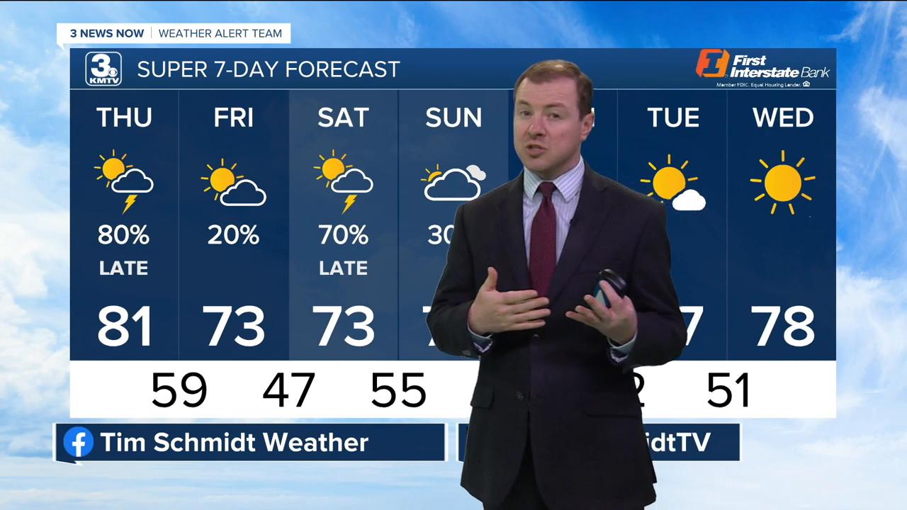 Thursday will be warmer and breezy as we push into the low to mid 80s. Most of the day will be dry, but spotty strong storms will start to pop up around sunset and continue into the night, arriving from the west, reaching Omaha around midnight. This line of strong to severe storms will push through the region between about 11 p.m. Thursday and 3 a.m. Friday, which will impact most of the region.
