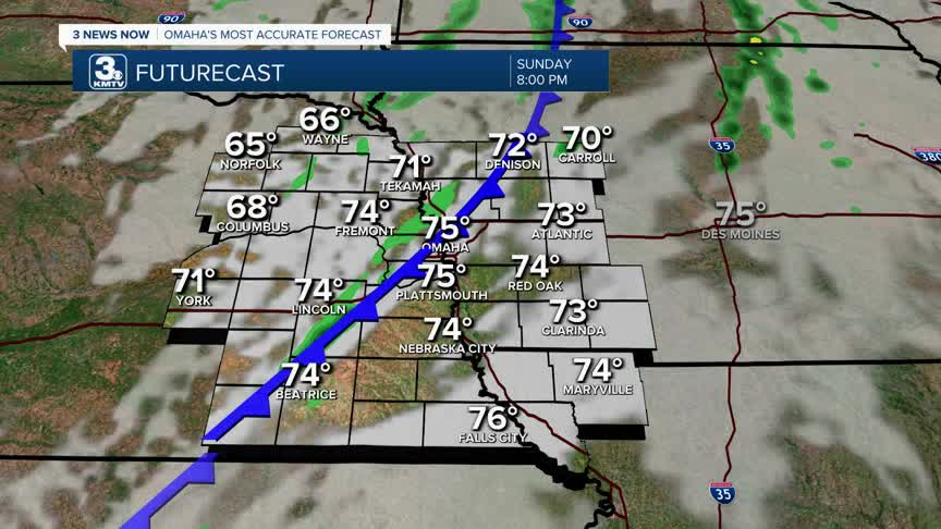 The cold front ushers in cooler weather on Monday, with highs only topping out in the upper 60s. Scattered showers may move in by the afternoon.