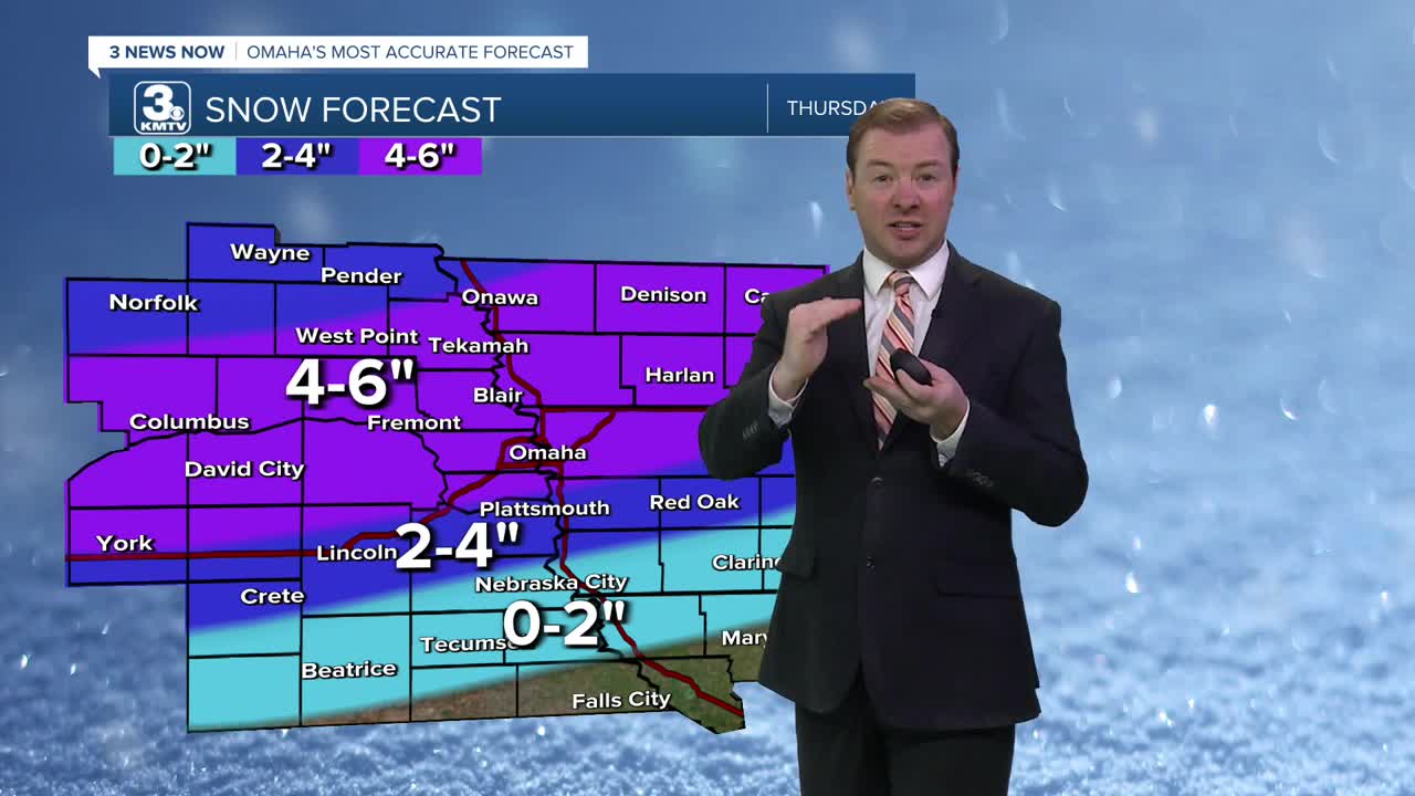 Snow showers will be moving through the region as we head into the evening. Accumulations of 2-4" will be common around the region. There is a narrow band of snow that is expected to produce from 4-6" of snow, mainly north of Omaha. The location where we could see this is from Columbus, to Fremont/Blair, to Harlan/Denison, IA.