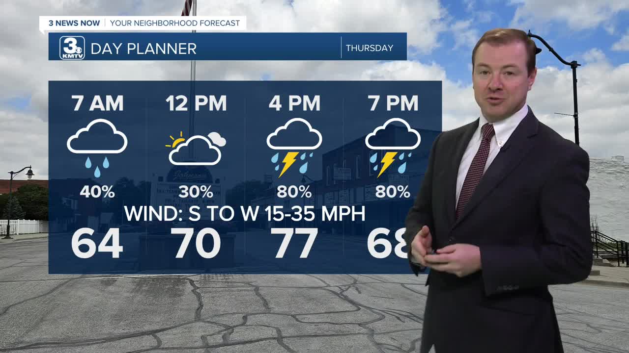Our next cold front arrives on Thursday, bringing a chance of storms and gusty winds up to 35 mph. While there could be some rain in the morning, the best time to see storms will be in the afternoon, developing around 1-3pm, reaching Omaha/Lincoln around 4-5pm, and western Iowa around 5-7pm. Some of these storms could be severe, with strong winds and large hail possible. 'Spin-up' tornadoes may also be possible in the late afternoon. Temperatures will be cooler, reaching the mid 70s.