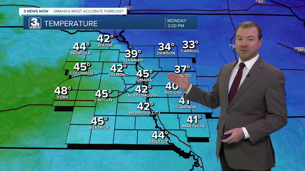 Temperatures will begin to warm overnight as a breezy south wind transports warmer air into the region. Omaha's temperature will rise in the low 20s by Monday morning. Those with a little snow still on the ground will stay in the 10s. Due to breezy south winds, wind chills will be around 10 degrees.