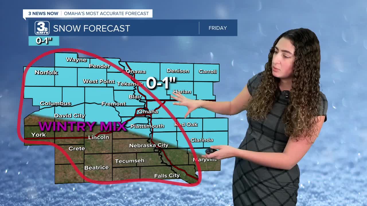 We are cloudy and dry for Friday morning, but a wintry mix (mostly snow & sleet) moves into northeast Nebraska around noon. This will then move southeast into the Omaha area after 2 pm. With a lot of dry air around, the precipitation that falls will be very light. Since it's expected to be light, accumulation and impacts will be on the low end. However, some roads could become slick by the afternoon, so take caution if you have to drive on Friday afternoon. The precip is over by Friday night.