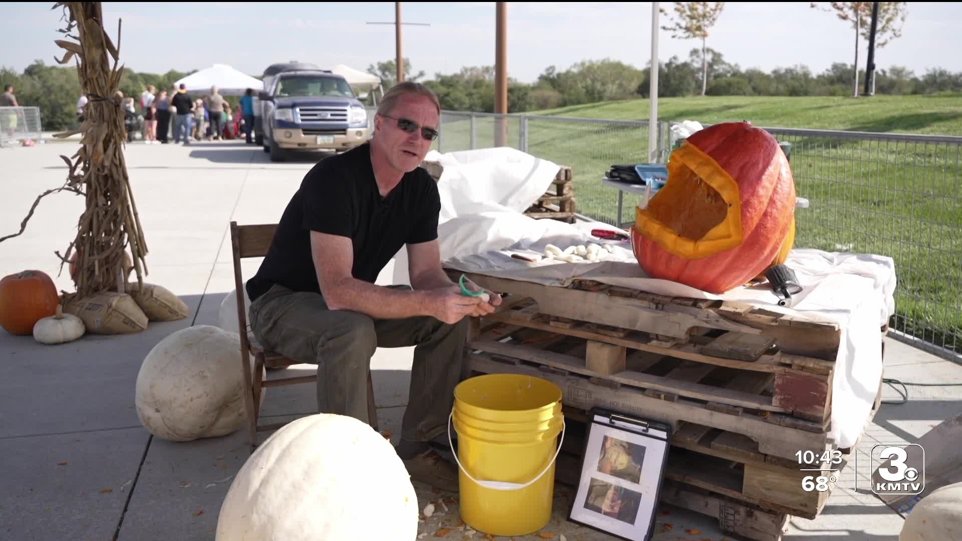 Matt Seely, an international competitor for Team Nebraska Snow Sculpting, was brought to Heartwood Preserve to showcase his talents. Instead of working with ice, Seely carved giant pumpkins for the fall celebration.